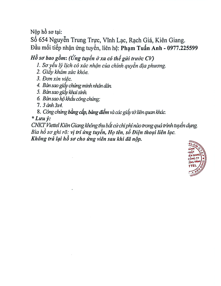 CHI NHÁNH KỸ THUẬT VIETTEL KIÊN GIANG THÔNG BÁO TUYỂN DỤNG
