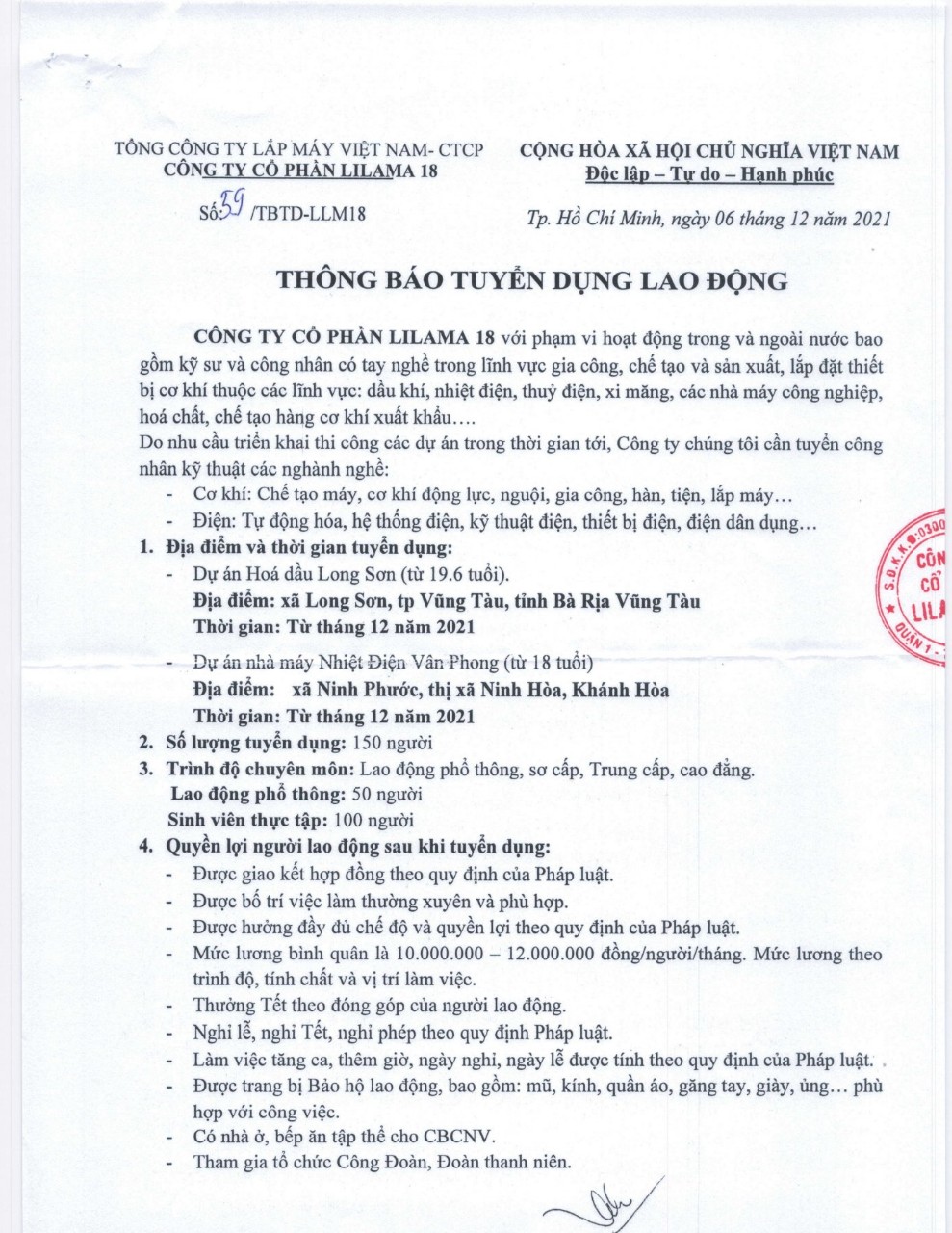 CÔNG TY CỔ PHẦN LILAMA 18 THÔNG BÁO TUYỂN LAO ĐỘNG