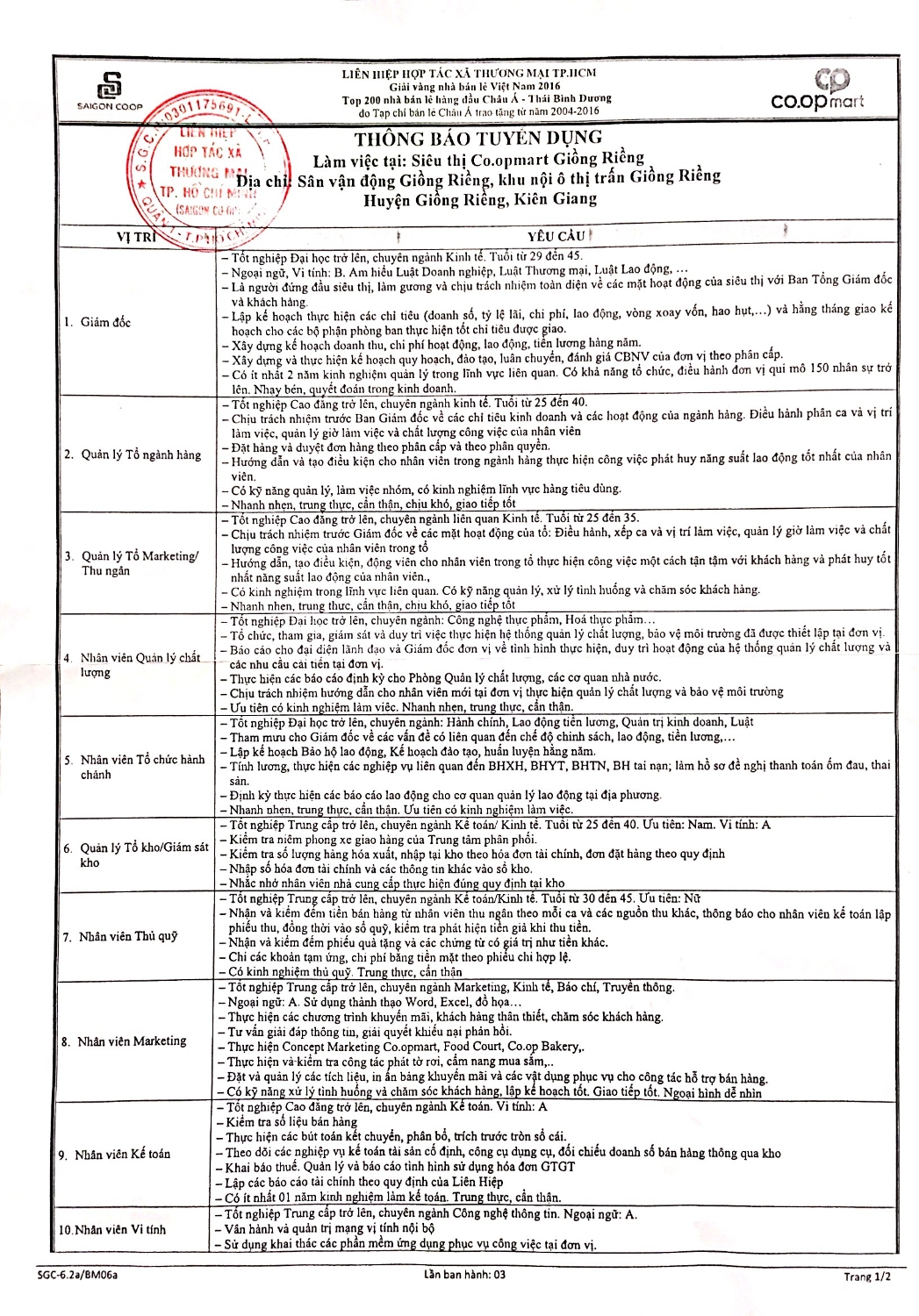Thông báo tuyển dụng làm việc tại siêu thị Co.opmart Giồng Riềng