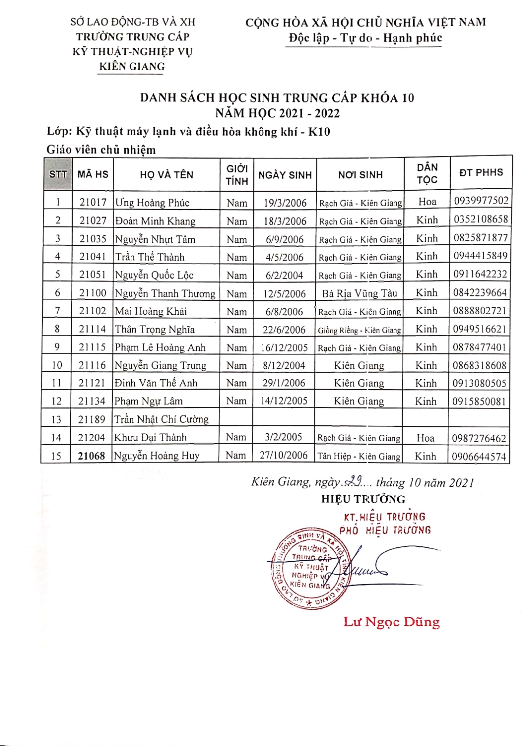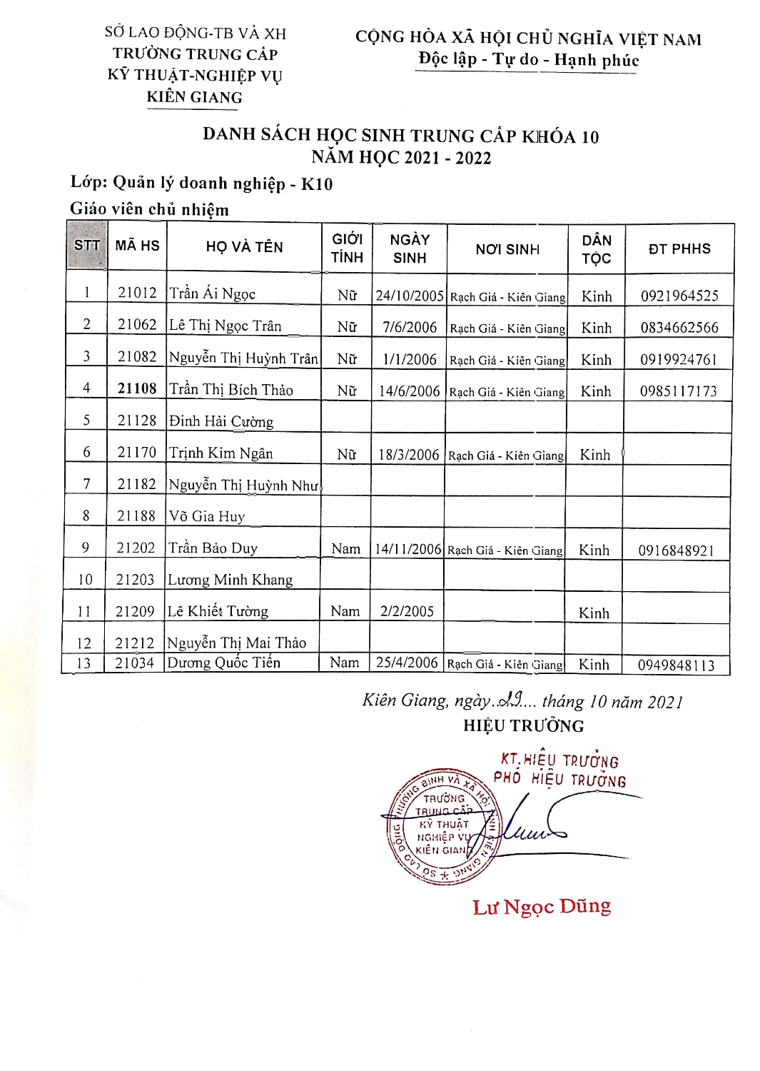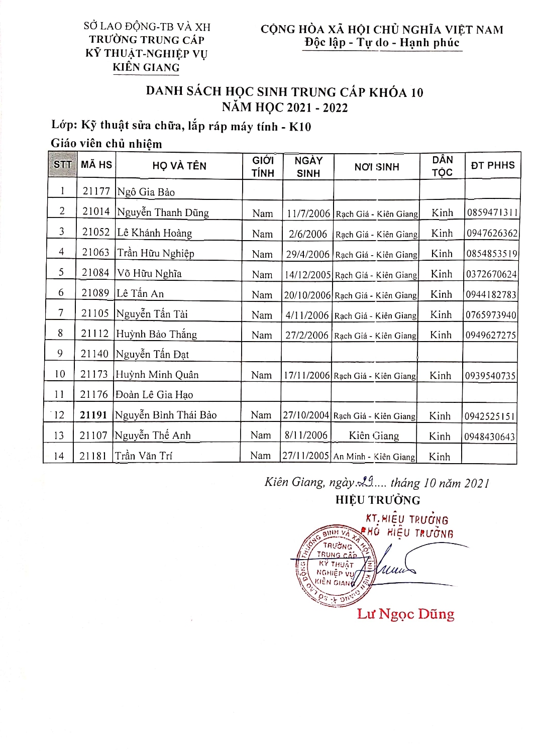 DANH SÁCH HỌC SINH TRUNG CẤP NGHỀ KHÓA 10 NĂM HỌC 2021-2022