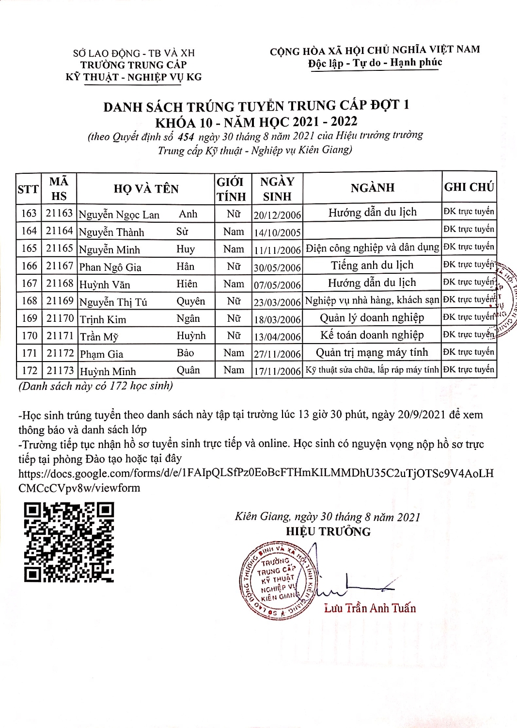 -Học sinh trúng tuyển theo danh sách này tập tại trường lúc 13 giờ 30 phút, ngày 20/9/2021 để xem thông báo và danh sách lớp |