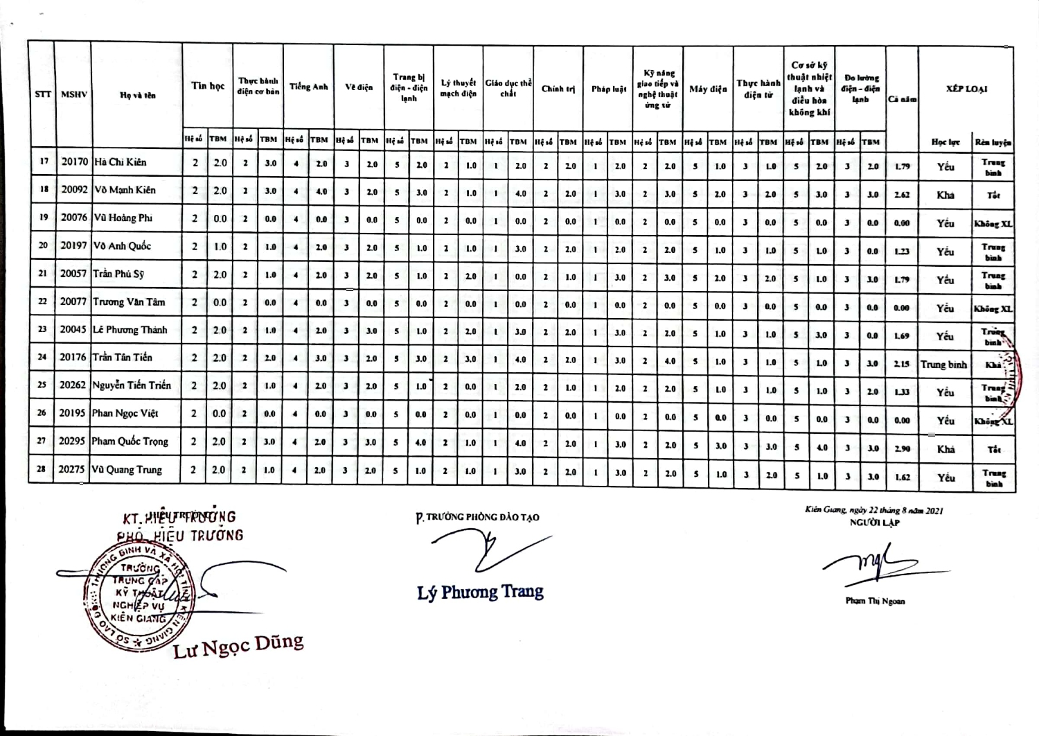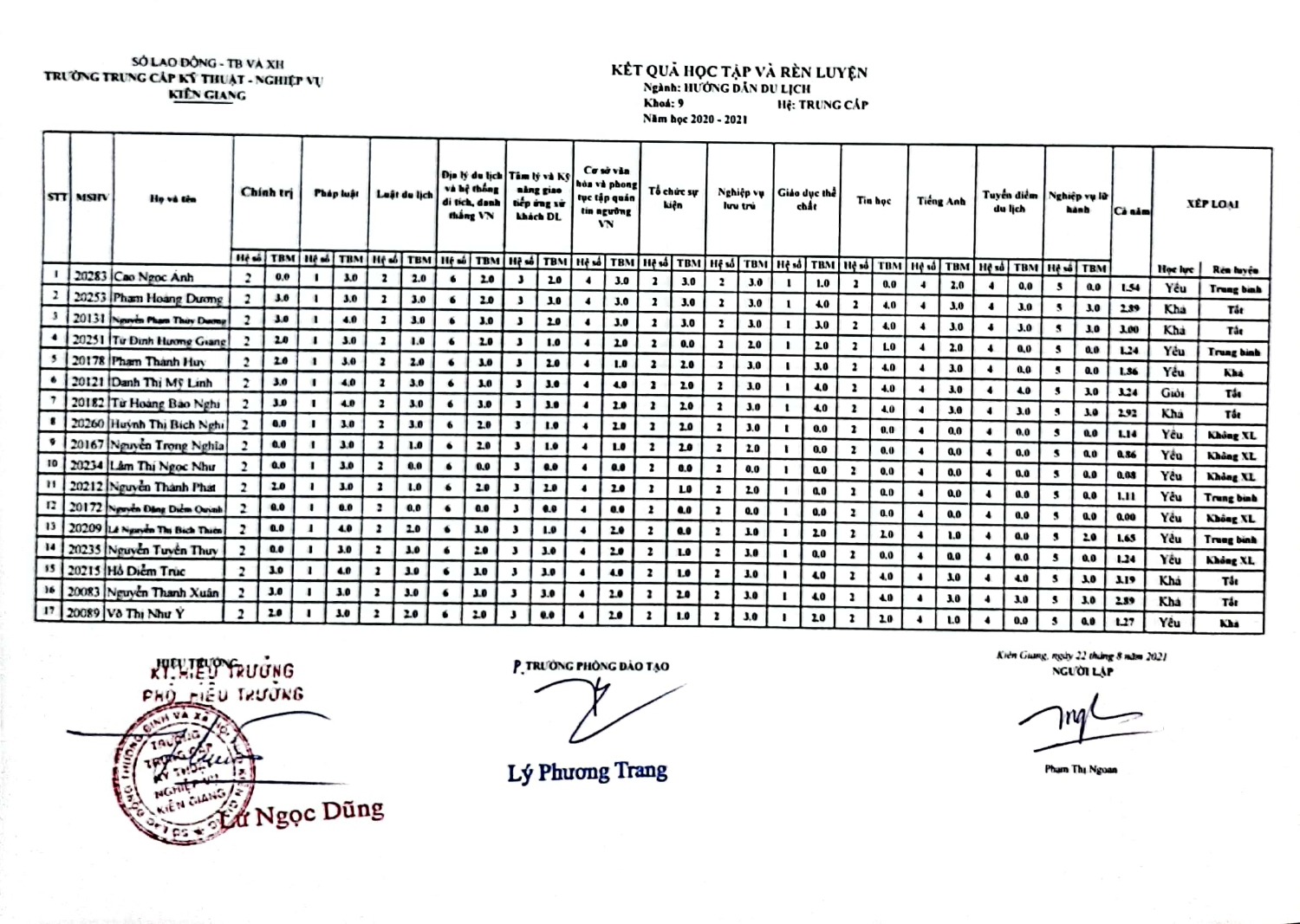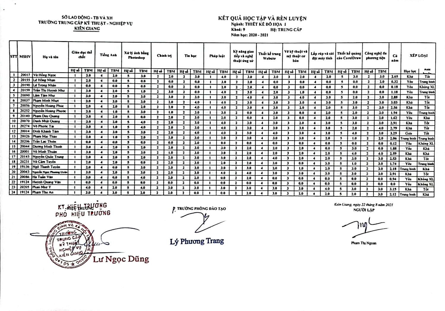 KẾT QUẢ HỌC TẬP RÈN LUYỆN KHỐI TRUNG CẤP KHÓA 9 NĂM HỌC 2020 - 2021