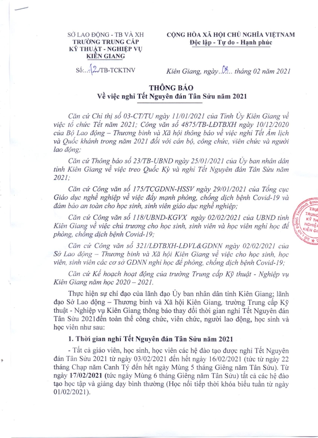 NHÀ TRƯỜNG THÔNG BÁO LỊCH NGHỈ TẾT NGUYÊN ĐÁN 2021